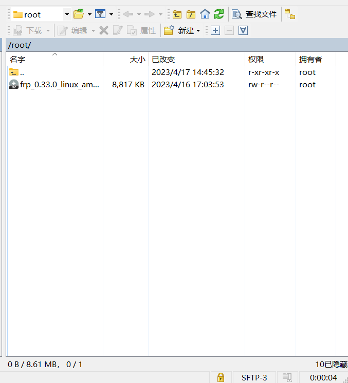 接下来直接下载FRP服务端,将FRP服务端下载到本地,浏览器直接打开这个链接开始下载 https://github.com/fatedier/frp/releases/download/v0.33.0/frp_0.33.0_linux_amd64.tar.gz ,下载后将文件传输进刚才登陆上服务器的winscp客户端,将本地的FRP客户端文件传入服务器的主目录中。