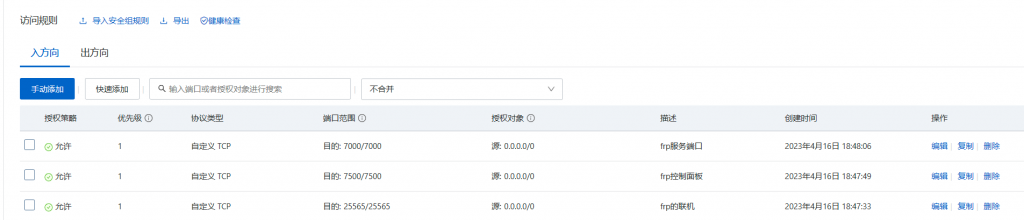接下来前往阿里云的实例的安全组配置防火墙,放行下面三个端口