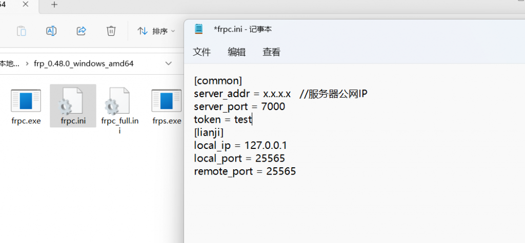 下载后解压,进入文件夹找到frpc.ini,这是客户端的配置文件,双击打开后改为