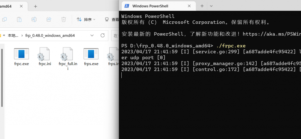 在FRP客户端文件夹中按住shift右键,选择终端,在终端中输入./frpc.exe 启动FRP客户端